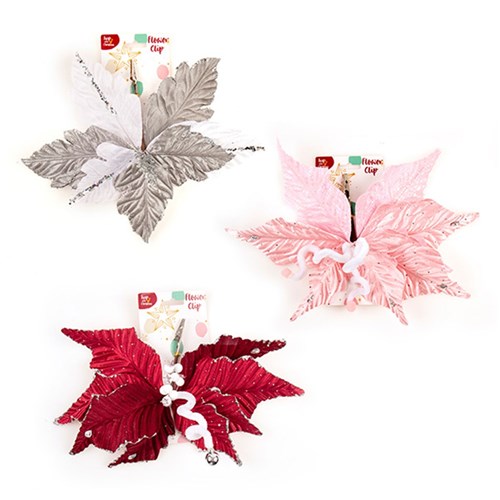 Decoration Xmas Ornaments Flower w Clip On 36cm 3 Asst