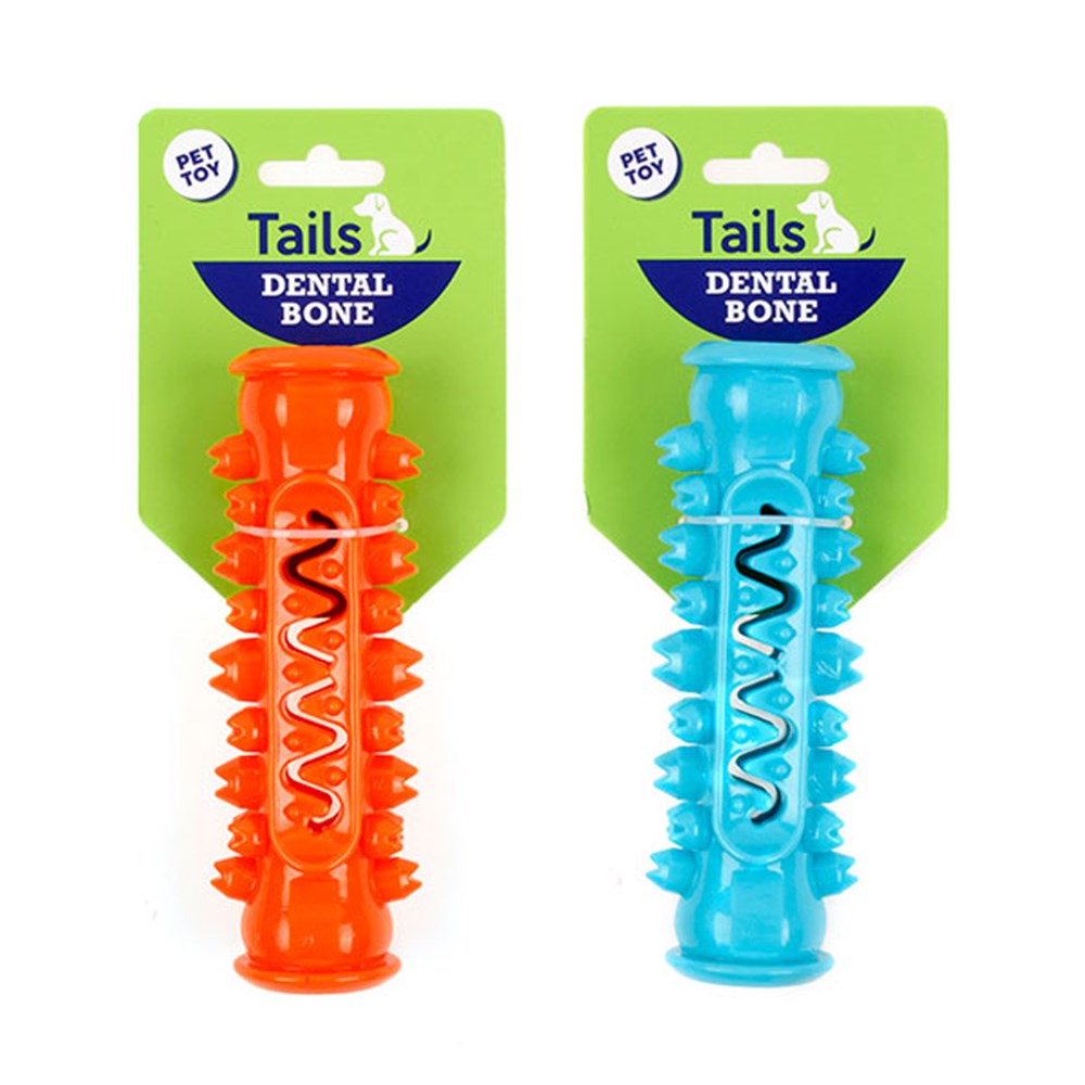 Dog Toy Dental Bone w Spike 15cm 2 Asst Cols Orange/Blue