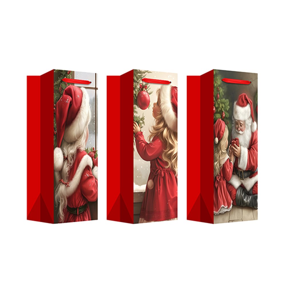 Gift Bag Xmas Flocked 210gsm Bottle w JHook Santa -