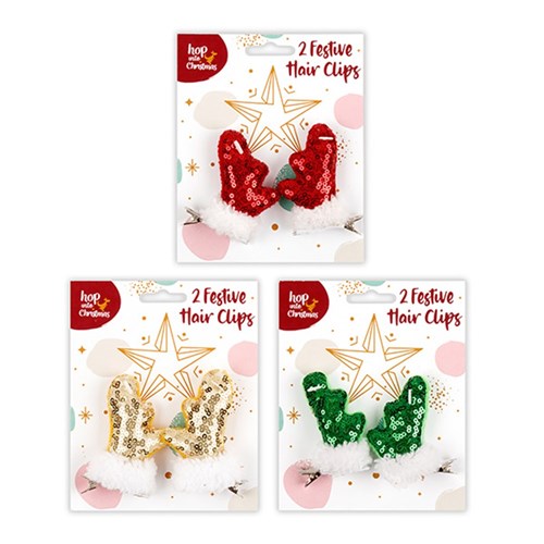 Hair Clip Novelty Xmas w Antler 2pk 7cm 3 Asst Cols