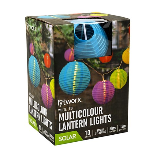Lights M/Col Chinese Lantern w White Leds Solar 2F Pk10