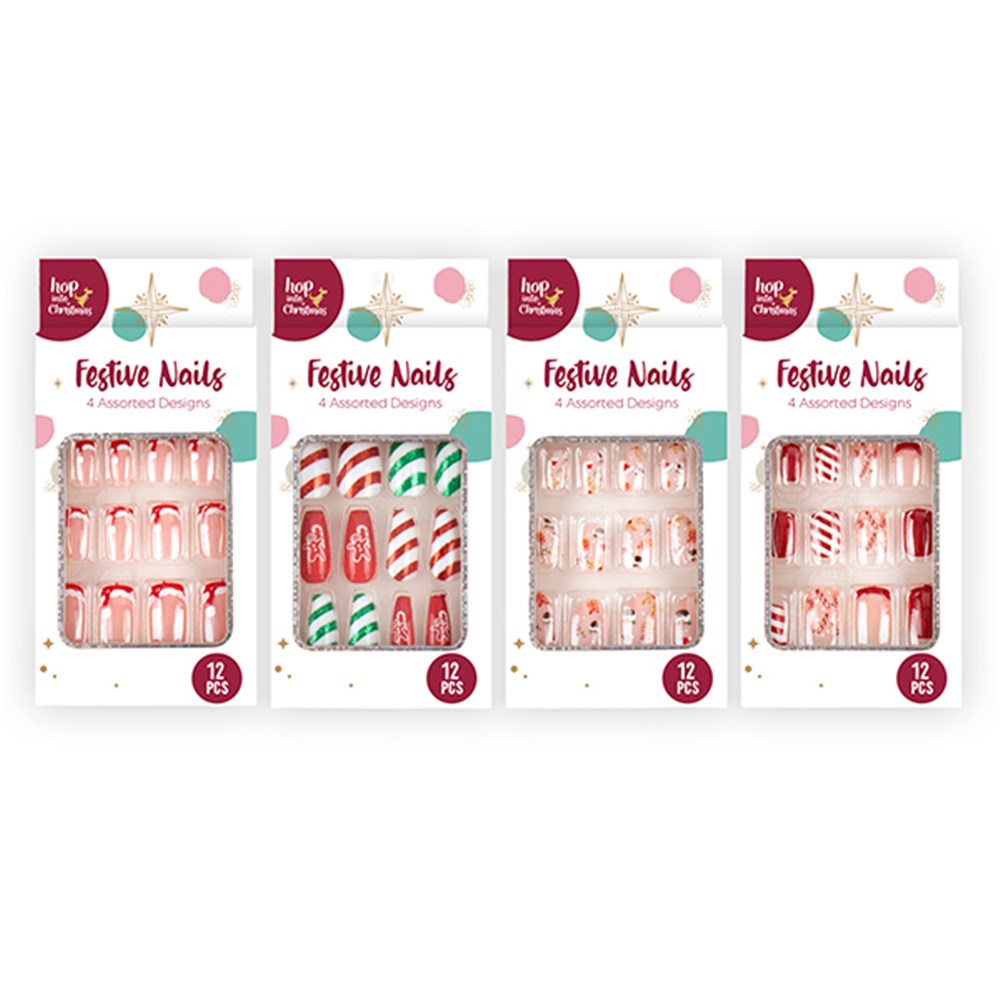 Nails Xmas Press On 12pk 4 Asst -